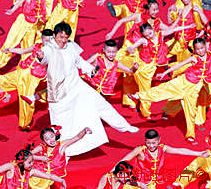 香港著名歌星成龍,十九日在北京參加“中華龍騰”海內外青年匯長城活動,在八達嶺古老的長城烽火臺上放聲高歌。作者:宗金柱