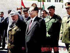 江澤民主席十五日抵達(dá)伯利恒對巴勒斯坦進(jìn)行國事訪問,巴勒斯坦總統(tǒng)阿拉法特舉行歡迎儀式。中新社記者:彭偉祥