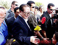 江澤民主席十四日在以色列參觀類似中國“人民公社”的農(nóng)莊——基布茲,接受兒童的獻(xiàn)花。中新社記者:彭偉祥