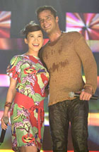圖文:瑞奇·馬丁演唱會(huì) 李玟現(xiàn)身掀高潮 2001年4月25日 17:12 ![]() 李玫以東瀛武士造型亮相,與瑞奇·馬丁合唱。 中新網(wǎng)新加坡4月25日消息:拉丁“搖臀天王”瑞奇·馬丁(Ricky Martin)昨晚第3度赴新加坡演唱,幾乎所有的觀眾在演出開始就一直跟瑞奇“伴舞”到結(jié)束。而嘉賓李玟現(xiàn)身與瑞奇·馬丁合唱,則為演唱會(huì)掀起高潮。 這場演出只有半小時(shí),從瑞奇·馬丁一出場,熱情澎湃的觀眾就開始興奮尖叫。而當(dāng)每唱完一首歌,觀眾給予掌聲時(shí),瑞奇·馬丁都會(huì)雙手合十,表示感激。 曾經(jīng)于去年10月在瑞奇·馬丁世界巡回演唱會(huì)上擔(dān)任亞洲區(qū)3場特別嘉賓的李玟,這次又再受邀,于演唱會(huì)上與瑞奇·馬丁深情合唱《Nobody Wants To Be Lonely》。二人在演唱完畢后的禮貌互吻,使得全場的觀眾瘋狂尖叫。 會(huì)后,主辦單位贈(zèng)送寫上“飛”字的大型中國字畫給瑞奇·馬丁,而李玟則由于在現(xiàn)場找不到剪刀,無法打開禮物,于是開玩笑說,希望里面是個(gè)巨型的鉆石,引得在場觀眾開懷大笑。 |