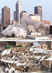 圖文:“貓王”告別演唱會場館爆炸拆卸 2001年07月10日 15:23 ![]() 體育館在數(shù)秒內(nèi)變?yōu)轭j垣敗瓦 中新網(wǎng)紐約7月9日消息:“貓王”埃爾維斯·普萊斯利生前舉行最后一場演唱會的“市場廣場體育館”,當?shù)貢r間8日在八響爆炸聲中被炸毀拆卸。 這座位于美國印第安納波利斯的體育館,當年共耗資2400萬美元興建,而在周日早上的拆卸工程中,逾600磅的黃色炸藥將之在短短12秒內(nèi)便變?yōu)橐黄j垣敗瓦。 這座體育館也是美國職業(yè)籃球隊印第安納步行者隊從1974至1999年間的舊主場,而場館的最后一次活動正是步行者隊在1999年10月?lián)魯—q他爵士隊的一場比賽。 至于當年“貓王”的最后一場表演,亦是于1977年6月在這里舉行。 |