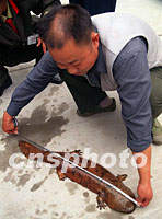 圖:為娃娃魚尋找放生地 2001年10月05日 10:35 ![]() 由于黑河引水工程,陜西省周至縣黑河大橋下游淺灘近日頻頻發(fā)現(xiàn)娃娃魚,大橋收費(fèi)站的工作人員出于對珍稀動物的保護(hù),準(zhǔn)備將這條重三公斤、身長七十五厘米的娃娃魚尋找放生地,以保護(hù)這一地區(qū)的生態(tài)平衡。中新社圖 尚鴻珠 攝 |