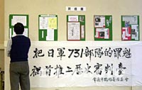 圖:東京舉行七三一部隊(duì)細(xì)菌戰(zhàn)展示會(huì) 2001年12月21日 20:01 ![]() 一百八十名中國(guó)受害者控告原日軍七三一部隊(duì)細(xì)菌戰(zhàn)暴行的訴訟將于近日結(jié)審,為支持中國(guó)原告的正義要求,日本有關(guān)民間團(tuán)體21日在東京舉行七三一部隊(duì)細(xì)菌戰(zhàn)展示會(huì),揭露七三一部隊(duì)在中國(guó)犯下的滔天罪行。圖為從中國(guó)受害地湖南省常德市寄來(lái)的橫幅及介紹七三一部隊(duì)培殖炭疽菌的介紹材料。中新社記者 陶光雄 攝 |