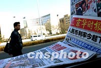 圖:人民幣利率今起下調(diào) 2002年02月21日 13:14 ![]() 一位市民二十一日經(jīng)過(guò)中國(guó)人民銀行北京總部前的一個(gè)報(bào)攤。為了克服世界經(jīng)濟(jì)增長(zhǎng)持續(xù)放緩對(duì)中國(guó)經(jīng)濟(jì)發(fā)展帶來(lái)的不利影響,保持中國(guó)國(guó)民經(jīng)濟(jì)持續(xù)、快速、健康發(fā)展,中國(guó)人民銀行今起再次下調(diào)人民幣存、貸款利率。中新社圖 武仲林 攝