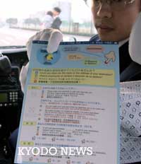 日本出租車(chē)以四國(guó)語(yǔ)言接待客人 其中包括中文 2002年03月12日 08:36 ![]() 用四國(guó)語(yǔ)言記有付錢(qián)方法等內(nèi)容的“輕松乘坐出租車(chē)傳單”(共同社)