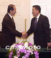 ![]() 澳門特區(qū)政府與澳門博彩股份有限公司二十八日簽署博彩經(jīng)營(yíng)批給合同,圖為行政長(zhǎng)官何厚鏵與澳博公司董事長(zhǎng)何鴻燊在簽約完成后互相握手。中新社記者 宗金柱 攝