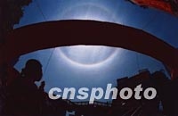 圖:福州突現(xiàn)日暈外“暈”奇觀 2002年04月14日 19:08 ![]() 十三日上午福州上空出現(xiàn)一道瑰麗的奇觀:在燦爛的太陽周圍有一個耀眼的光環(huán)。半小時過后,出現(xiàn)一個相對顏色淺一些的光環(huán)(如圖)。十幾分鐘后,光環(huán)漸漸淡去,這種美麗奇觀前后持續(xù)了約一個多小時,讓觀者嘖嘖稱奇。據(jù)省氣象臺說;這種現(xiàn)象在氣象學中稱“日暈”,對天氣沒有什么影響。中新社圖 楊婀娜 攝