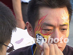 圖:京城流行“世界杯人體彩繪” 2002年06月02日 12:44 ![]() 隨著2002世界杯足球賽的開賽,京城許多熱情的球迷在臉上等身體部位繪上世界杯的圖案。圖為一球迷在臉上繪上“飛火流星”足球的圖案,“世界杯人體彩繪”在京城流行起來(lái)。中新社記者 章永哲 攝