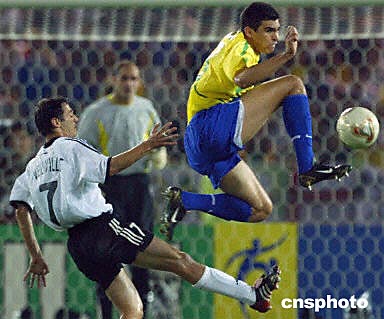 圖:世界杯德巴決戰(zhàn) 盧西奧騰空躍起阻擋對手 2002年06月30日 19:49 ![]() 6月30日2002韓日世界杯決賽巴西與德國隊(duì)的決賽在日本橫濱國際競技體育場進(jìn)行,上半場比分為0:0。圖為巴西隊(duì)盧西奧騰空躍起阻擋德國前鋒諾伊維爾。