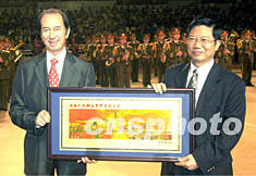 ![]() 中國人民解放軍軍樂團八日晚在澳門綜藝館舉行盛大演出,澳門娛樂旅游有限公司董事總經(jīng)理何鴻燊向軍樂團贈送澳門全景畫框。李剛 攝