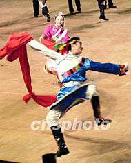 ![]() 中國人民解放軍樂團八日在澳門綜藝館演出活潑歡快的藏族舞蹈。李剛 攝