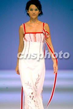 圖:香港設計師鄭兆良的“仿旗袍天女下凡裝” 2002年07月12日 10:09 ![]() “2003香港春夏時裝節(jié)”7月10日晚舉行香港十位頂尖設計師作品展示,模特展示著名設計師鄭兆良設計的一款仿旗袍低胸配紅長飄帶女裙,恍如天女下凡。任晨鳴 攝