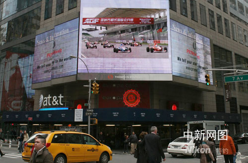在號(hào)稱世界金融中心的紐約,時(shí)代廣場(chǎng)上路透社的巨幅電子屏?xí)円归W爍,這個(gè)以快速報(bào)道世界各大洲重大事件聞名的新聞窗口上,吸引著世界商圈的目光。AGF的賽車雪邦站的信息被持續(xù)播放了一整天。