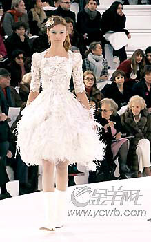 該品牌的高級定制服,向來就偏重經典的傳統(tǒng)風格,掌門人KarlLagerfeld沿襲了香奈兒女士穿著設計的靈感,白色平底靴,斜呢紋套裝還有白色透明褶皺硬紗翻領,皆有可尋。