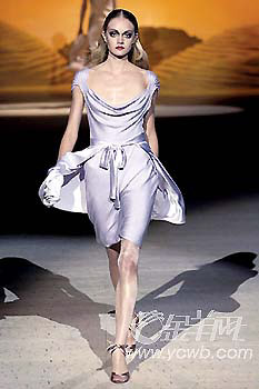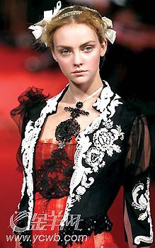 ChristianLacroix的時裝以設計復雜多變、風格瑰麗多彩見稱,他在這一季的高級定制女裝展中,最搶眼的是一襲如夢似幻的象牙色的雪紡紗短裙,紗裙上有精致的刺繡花朵,不論是用料和細節(jié)處理都極為細致,美麗得令人屏息。“金”是最能閃耀奢華的色調,更被ChristianLacroix于今季帶有濃郁宮廷色彩的系列中大量運用:鑲滿珠寶鉆飾的包款鞋,層疊在衣領、袖口或是裙擺的蕾絲荷葉邊,當然還有各式各樣富麗貴氣的頭飾。配合瑰麗的設計風格,充分表現出法國式的艷麗。