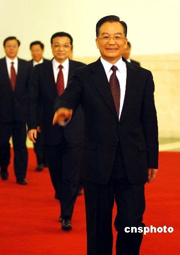 3月18日上午,十一屆全國人大一次會議在北京人民大會堂閉幕。會后,十一屆全國人大一次會議舉行記者會,國務(wù)院總理溫家寶會見中外記者并答記者問。李克強(qiáng)、回良玉、張德江、王岐山四位副總理出席。中新社發(fā) 王東明 攝