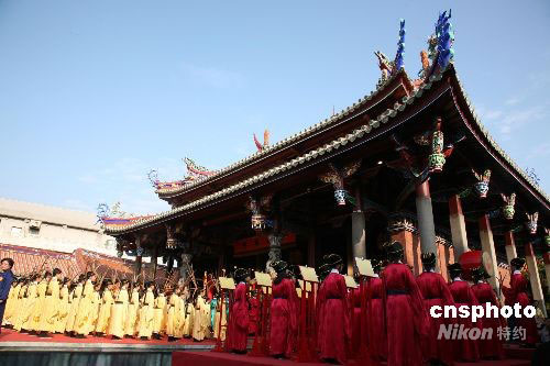 今年是孔子誕辰二千五百五十八周年,原應(yīng)九月二十八日舉行的臺(tái)北祭孔大典,因強(qiáng)臺(tái)風(fēng)“薔薇”來(lái)襲而延至十月五日進(jìn)行。中新社發(fā) 楊旭 攝