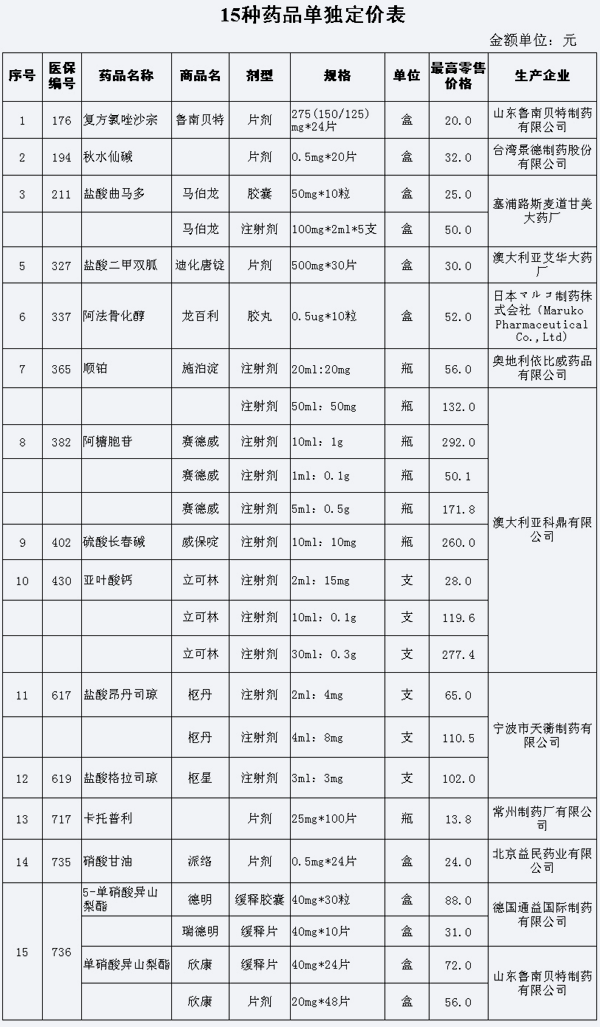 中新網(wǎng)11月23日電 國家發(fā)改委發(fā)布消息稱,根據(jù)國家發(fā)改委組織專家論證的意見,為滿足臨床需要,現(xiàn)將部分仿制藥品單獨定價方案予以公布。表列藥品價格自2005年11月14日起執(zhí)行。