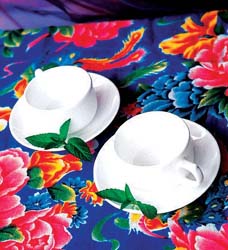 白色的骨瓷茶具搭配藍(lán)色大花布餐墊,細(xì)膩和熱烈奇妙地結(jié)合在一起。把藍(lán)印花布按照所需尺寸裁剪,然后將周邊仔細(xì)縫好熨平,就做成了樸實(shí)無華的餐墊。