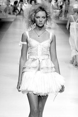 性感亮點:通透面料下面若隱若現(xiàn)的內(nèi)衣和肌膚,非常吸引人的眼球。D&G本季主打的叛逆少女,就巧妙利用白色蕾絲雪紡的通透感,讓女人的身體猶抱琵琶。