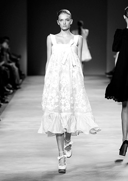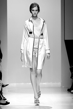 時尚點評:這一季的透明質(zhì)感的白衣大多擁有“浪漫”的特點,帶著地中海浪漫風(fēng)情的同時還帶有上世紀(jì)七八十年代少女服飾的影子。另外,白色透明服飾的互相搭配也為性感加分,比基尼加上白紗的長外套,性感之極的同時和今年的休閑風(fēng)也相得益彰。