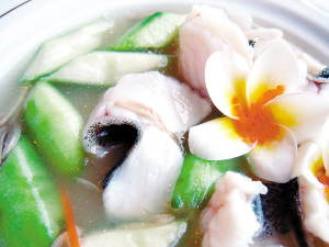 雞蛋花相信廣州人都不會(huì)陌生,我們通常拿它來煲湯,取其去濕氣、清熱毒、生津止渴的功效。這道“百花過橋魚”里面就有雞蛋花,此外還有菊花瓣,魚片是浸熟的。這個(gè)名字中的“百花”還有另一個(gè)含義,在廣州餐飲界行話里把花膠也叫做“百花餡”。