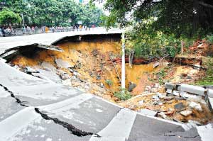昨日下午4時許,記者來到事故現(xiàn)場,窟窿剛好處于雙橋路和珠江大橋的引橋交界處, 面積大約有100平方米,深約5米?吡倪吘,水泥的路面碎裂,讓人覺得隨時可能會掉進(jìn)里面。原本在路邊的一根路燈栽入了窟窿中,兩棵樹也陷了進(jìn)去。警方在現(xiàn)場拉起了警戒線,地鐵公司等相關(guān)部門的工作人員正緊張?zhí)幚怼?/p>