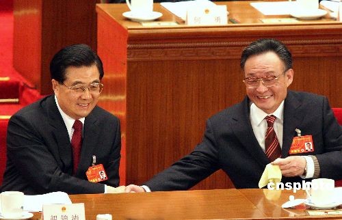 3月8日,十一屆全國人大一次會(huì)議第二次全體大會(huì)在北京人民大會(huì)堂舉行,受十屆全國人大常委會(huì)委托,吳邦國委員長作常委會(huì)工作報(bào)告。圖為報(bào)告結(jié)束后,胡錦濤與吳邦國握手。中新社發(fā) 張宇 攝