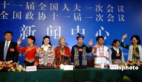 三月十日下午,八位出席十一屆全國人大一次會議的少數(shù)民族代表,在北京兩會新聞中心接受中外媒體集體采訪。中新社發(fā) 王東明 攝