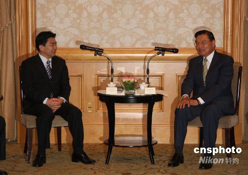臺灣;鶗麻L江丙坤(右)十月一日在臺北西華飯店會見前來臺灣參訪的中共江蘇省委常委、蘇州市委書記王榮。經(jīng)常到蘇州看望臺商的江丙坤,希望蘇州在中小臺資企業(yè)融資、勞動合同法的實(shí)施及臺資企業(yè)后續(xù)發(fā)展的土地三個問題上,更多地向臺商提供輔導(dǎo)和協(xié)助。中新社發(fā) 耿軍 攝