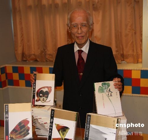 為祝賀詩人余光中八十大壽,臺(tái)灣九歌出版社特意出版余光中最新詩集《藕神》、近十年的文學(xué)評(píng)論精選《舉杯向天笑》、翻譯英國名作家王爾德的劇本《不要緊的女人》等五本書,展現(xiàn)他在文學(xué)路上的成就。十月二日,臺(tái)灣藝文界提前為他祝壽,余先生在五本新書前留影。中新社發(fā) 耿軍 攝