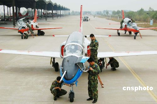 圖為10月22日,濟空某飛行學(xué)院飛行訓(xùn)練現(xiàn)場一組鏡頭。擔(dān)負(fù)培養(yǎng)和造就高素質(zhì)新型飛行人才重任的濟空某飛行學(xué)院,在飛行人員中開展“一心一意跟黨走、苦練精飛謀打贏”的主題活動,在機務(wù)和后勤官兵中開展“立足本職作貢獻、再接再厲立新功”為主題的崗位練兵和安全競賽活動,把學(xué)習(xí)十七大精神的政治熱情轉(zhuǎn)化到“牢記使命責(zé)任,苦練打贏本領(lǐng)”的具體行動中。中新社發(fā) 耿國慶 攝