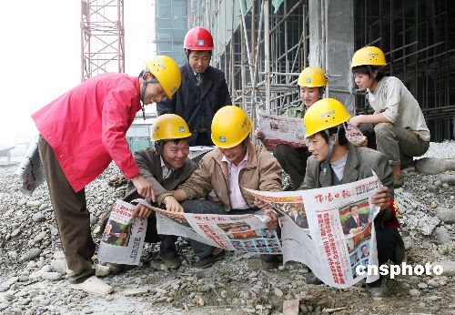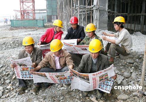 10月23日上午,綿陽長(zhǎng)虹工業(yè)園虹歐PDP項(xiàng)目建筑工地,中建公司的農(nóng)民工在閱看《綿陽日?qǐng)?bào)》有關(guān)十七大的報(bào)道。他們看到十七大報(bào)告中關(guān)于完善和落實(shí)國家對(duì)農(nóng)民工的政策,依法維護(hù)勞動(dòng)者權(quán)益等內(nèi)容后喜笑顏開,表示將安全生產(chǎn),把工程項(xiàng)目盡快完成,為祖國建設(shè)貢獻(xiàn)自己的力量。中新社發(fā) 蒲滔 攝