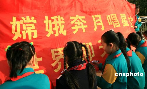 11月5日,“嫦娥一號”衛(wèi)星成功減速,進入月球軌道。山東師大附小為此舉辦了“嫦娥一號”主題慶祝儀式,師生們在祝賀“嫦娥一號”成功奔月的橫幅上簽字。孩子們還向研制“嫦娥一號”的科學(xué)家們寫了熱情洋溢的祝賀信,表達對他們的祝賀和自己要好好學(xué)習(xí)、建設(shè)祖國的決心。中新社發(fā) 周青先 攝