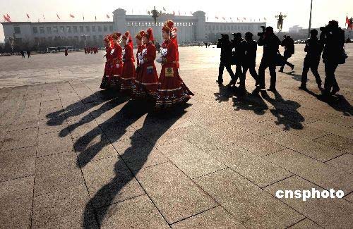 三月五日上午九時(shí),十一屆全國(guó)人大一次會(huì)議在北京人民大會(huì)堂隆重開(kāi)幕。攝影記者在天安門(mén)廣場(chǎng)窮追不舍拍攝穿著少數(shù)民族服飾的亮麗女服務(wù)員。中新社發(fā) 廖攀 攝