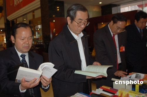 3月8日下午,參加完十一屆全國人大一次會議第二次全體會議的全國人大代表、廣西壯族自治區(qū)主席馬飚(左二)等人,在廣西大廈內(nèi)的書攤前選購圖書,會議間隙學(xué)習(xí)“充電”。中新社發(fā) 劉萬強 攝