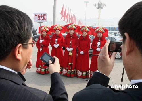三月十日,十一屆全國人大一次會議在北京舉行第三次全體大會,會議結(jié)束后,代表委員忙著抓拍美麗瞬間。中新社發(fā) 任海霞 攝