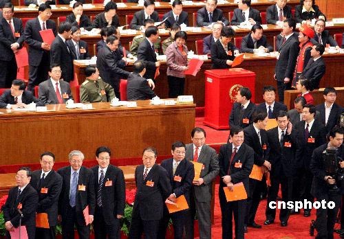 3月16日上午,十一屆全國人大一次會(huì)議第六次全體會(huì)議在北京人民大會(huì)堂舉行,決定國務(wù)院總理、中央軍委副主席、委員的人選,選舉最高人民法院院長、最高人民檢察院檢察長。圖為全國人大代表排隊(duì)進(jìn)行表決和選舉投票。中新社發(fā) 張宇 攝