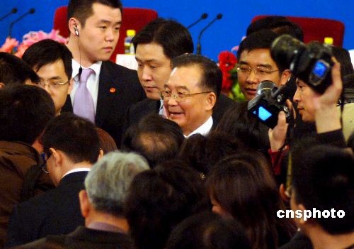 三月十八日上午,十一屆全國人大一次會議在北京人民大會堂閉幕,國務院總理溫家寶會見中外記者并答記者問。圖為會后溫家寶走到記者席與大家握手問候。中新社發(fā) 王東明 攝