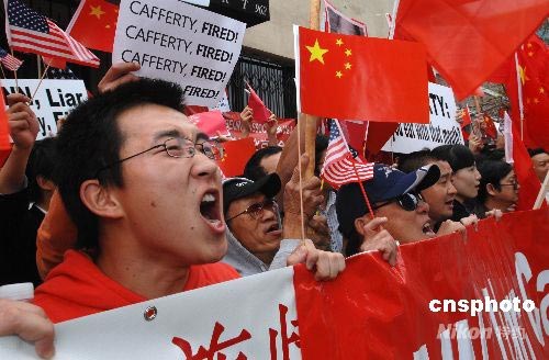 當(dāng)?shù)貢r間4月19日上午,留學(xué)生張曉龍(前)與華人華僑一起高喊抗議口號。洛杉磯當(dāng)天爆發(fā)十幾年來最大規(guī)模的華人華僑抗議示威活動。數(shù)千名華人華僑和留學(xué)生在CNN洛杉磯分部門前參加和平示威,要求CNN向公開鄭重道歉,并開除卡弗蒂。中新社發(fā) 張煒 攝