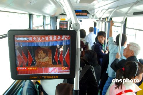 10月21日,北京公共汽車上的電視屏幕播放中共七大的紀錄影片。當日,中共十七大完成各項議程后在北京人民大會堂閉幕。中新社發(fā) 廖攀 攝