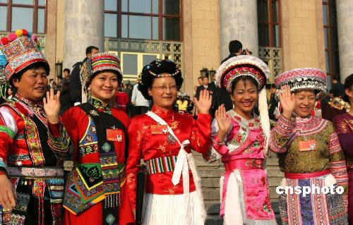 3月5日,十一屆全國人大一次會議在北京開幕,身著節(jié)日盛裝的各少數(shù)民族代表,進(jìn)入會場前在北京人民大會堂前接受媒體采訪。中新社發(fā) 柳俊武 攝