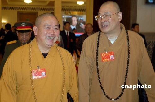 3月10日上午,十一屆全國人大一次會議在北京人民大會堂舉行第三次全體會議,中國佛教協(xié)會副會長、河南省佛教協(xié)會會長、河南省少林寺方丈釋永信(左),中國佛教協(xié)會常務(wù)副會長、湖南省佛教協(xié)會會長釋圣輝共同出席。中新社發(fā) 劉萬強(qiáng) 攝
