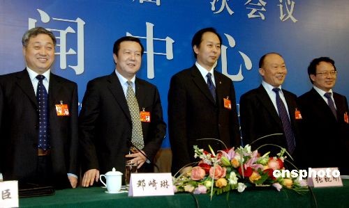 三月十一日晚,中國(guó)五大鋼鐵行業(yè)老總在兩會(huì)新聞中心接受中外媒體集體采訪。他們是中國(guó)鞍鋼集團(tuán)公司總經(jīng)理張曉剛(中)、首鋼總公司董事長(zhǎng)朱繼民(右二)、武漢鋼鐵(集團(tuán))公司總經(jīng)理鄧崎琳(左二)、太原鋼鐵(集團(tuán))有限公司總經(jīng)理李曉波(右一)、內(nèi)蒙古包頭鋼鐵(集團(tuán))有限公司董事長(zhǎng)崔臣(左一)。中新社發(fā) 王東明 攝