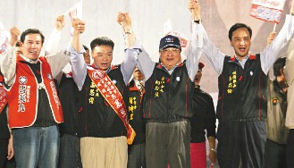 國民黨2008參選人馬英九(左一)與臺中市長胡志強(右二)、桃園縣長朱立倫(右)昨晚到臺南,幫“立委”候選人高思博(左二)站臺。(圖:臺灣《聯(lián)合報》)