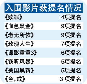 被喻為“英國奧斯卡”的2008年英國影視藝術(shù)文化學院頒獎禮(BAFTA),前日公布提名名單,《色,戒》報名角逐最佳電影、導演及女主角等11個項目,結(jié)果除了較早前公布入圍最佳新人(湯唯)和外語片之外,只有最佳服裝設計(樸若木)能獲提名;而凱拉·奈特利主演的《贖罪》,則獲得本屆最多14項提名,成為大熱之選。