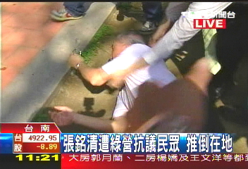2008年10月21日,大陸海協(xié)副會長張銘清在臺進(jìn)行學(xué)術(shù)交流到臺南市參觀時,被極端分子推倒在地;當(dāng)張銘清準(zhǔn)備乘車離開時,有人甚至跳上張銘清座車車頂狂踩,試圖阻止張銘清離開。