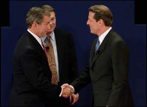 圖文:美國總統(tǒng)候選人展開第二場辯論 2000年10月12日 16:16 ![]() 距離11月7號的大選不足4周,戈爾(右)與小布什(左)再度在電視辯論上交鋒。兩人在開始交戰(zhàn)時,先握手示好。 中新網(wǎng)北京10月12日消息:美國民主黨總統(tǒng)候選人、現(xiàn)任副總統(tǒng)戈爾,與共和黨總統(tǒng)候選人、得州州長布什,已經(jīng)在美東時間周三晚9時展開他們的第二場辯論。 這次辯論在北卡羅萊納州的WakeForest大學舉行,并仍然由公共電視臺(PBS)的萊勒主持。 這次辯論的方式將不同于第一次。兩位總統(tǒng)候選人采取隨意的談話方式,坐下來回答主持人的提問。這正是布什所擅長的方式。每人有2分鐘的時間回答提問,在辯論結束時,有2分鐘的時間作結束演講。 估計兩人會繼續(xù)就政府角色和架構針鋒相對,但中東和平和南斯拉夫局勢等外交問題也會是辯論的議題之一。 戈爾布什的第一場辯論已于本月3日晚進行,原來預期多達7,500萬民眾收看首場辯論。但實際上只有4,600萬人收看了第一場辯論。 首場辯論會結束后,美國各大媒體做的民調(diào)顯示,民眾認為戈爾的表現(xiàn)略勝布什一籌,但戈爾未能擴大領先布什的優(yōu)勢。首場辯論對選民并未產(chǎn)生預期的影響,民調(diào)表明,在首場辯論后,仍然有超過22%的選民心意未決。(圖文據(jù)外電) |