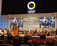 亞歐會(huì)議閉幕式,中國總理朱镕基的形象出現(xiàn)在主席臺的的屏幕上。中新社記者:王曉暉 攝