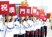 澳門電信局職工十六日手舉標語牌,參加慶;貧w一周年的系列活動。中新社傳真 宗金柱攝